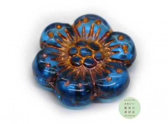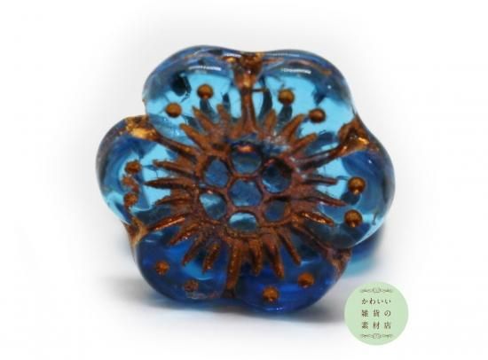 14mm チェコビーズ プレス ワイルドローズ 半透明アクアマリンブルー&ブロンズ(チェコガラスビーズ/フラワー/花)3個セット BCZ-0067