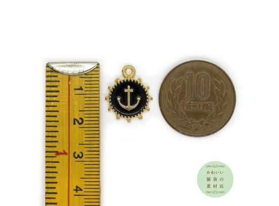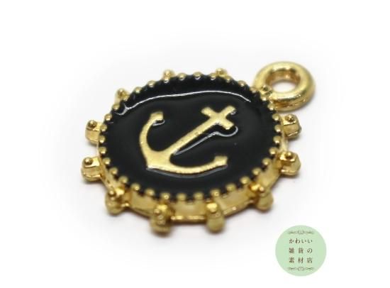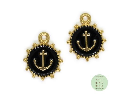 船のハンドル(操舵輪)の中にイカリマークの入ったエナメルチャーム(ブラック/ゴールド/マリン)2個セット CE-0196