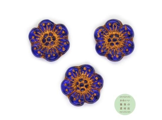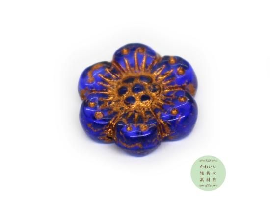 14mm チェコビーズ プレス ワイルドローズ 半透明ロイヤルブルー&ブロンズ(チェコガラスビーズ/フラワー/花)3個セット BCZ-0139