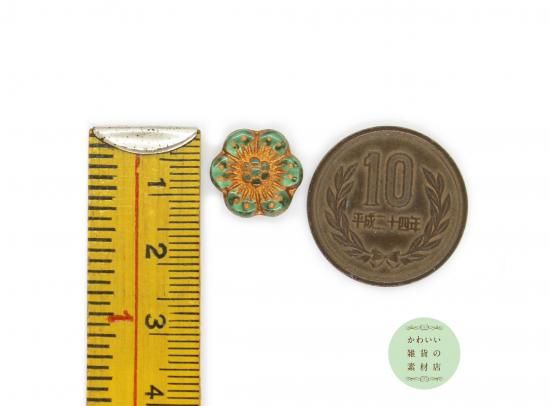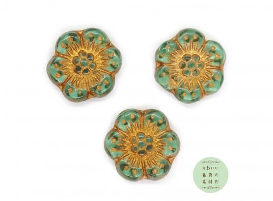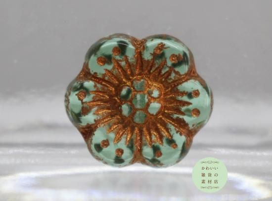 14mm チェコビーズ プレス ワイルドローズ 半透明ミントグリーン&ブロンズ(チェコガラスビーズ/フラワー/花)3個セット BCZ-0162